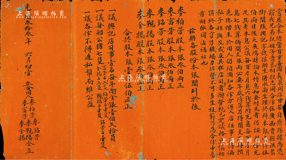 光绪叁拾叁年(1907年)广西地区“兴记字号”合同1份,内由麦柏芳、麦富芳等兄弟叔侄5人合伴在广西贵县铁象街开设“张兴记字号”,采办生猪水面生理,各出股本银叁伯两(合计股本银壹仟伍伯两),且详列公议条款等;此种清代广西省传统式老股票存世罕见,背有贴补,六五成新