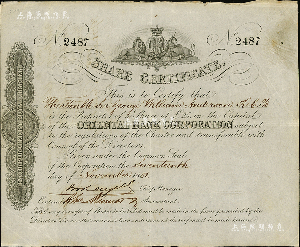 1851年丽如银行(中国第一家外商银行)股票25镑,此为最早期年份版,少见,八五成新
