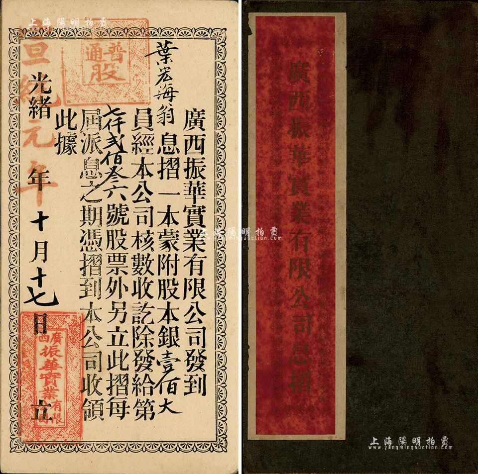 光绪改宣统元年(1909年)广西振华实业有限公司息摺1本,内为股东叶宏海氏承购股本银壹佰大员,少见,八成新