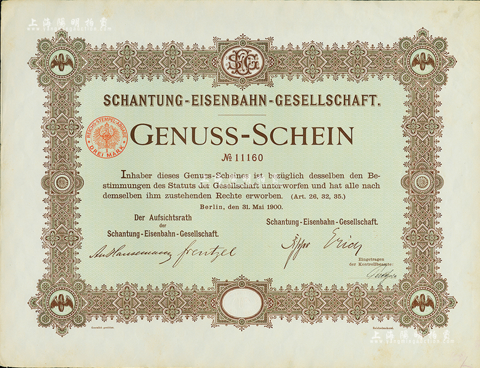1900年山东胶济铁路公司股票,创始人优先股1股,满版水印,附带有息票;该公司由德国占领青岛的殖民地政府所倡办,总部设于青岛;少见,九成新