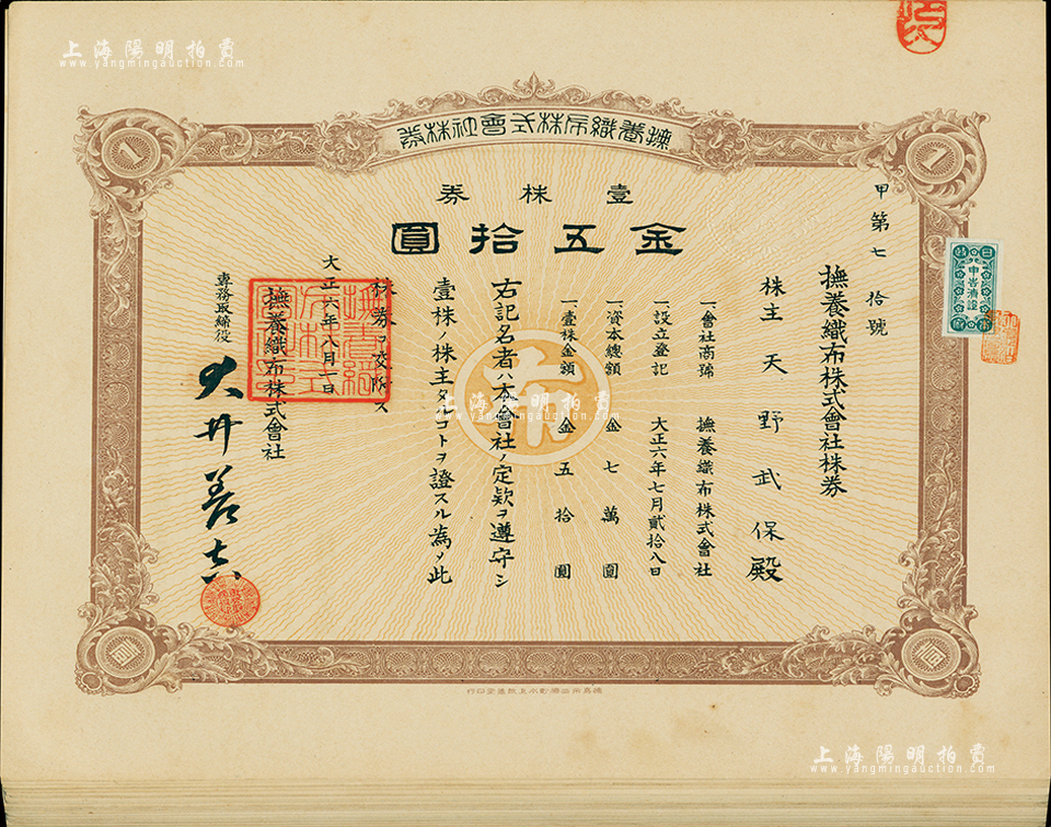 大正六年(1917年)抚养织布株式会社株券共26枚,均为壹株券金五拾圆,九成新