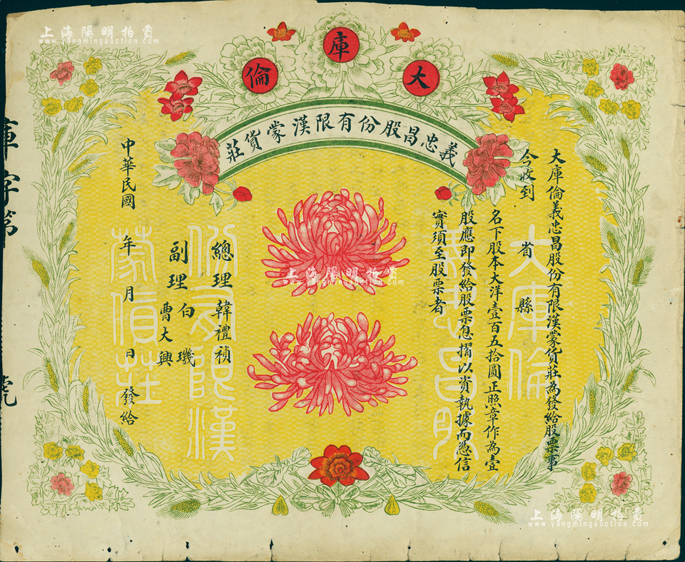 民国年(大库伦)义忠昌股份有限汉蒙货庄股票,壹股大洋壹百五拾圆,未正式填用,图案精美;大库伦即今蒙古首都乌兰巴托,此票可证明蒙古原为中国领土,历史意义重大,七五成新