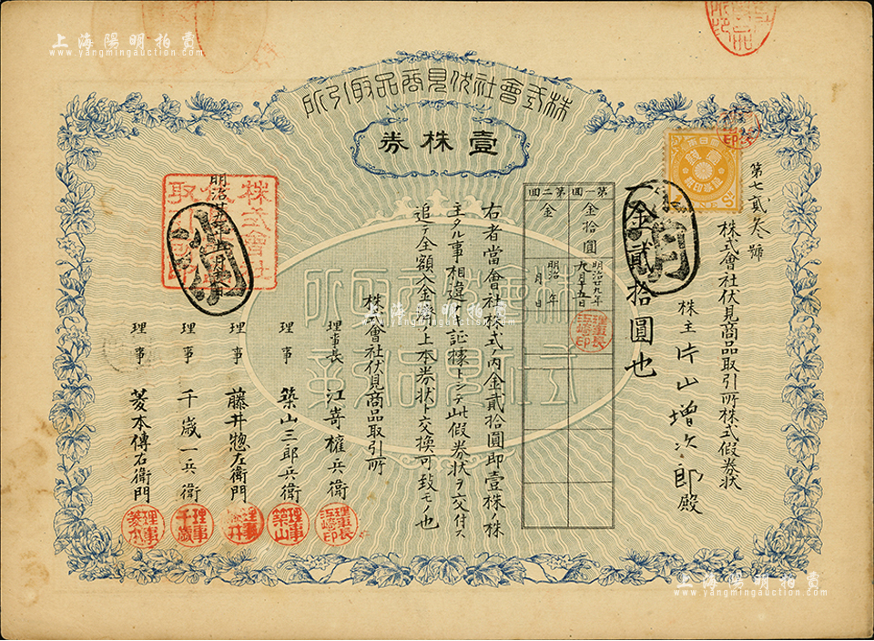 明治廿九年(1896年)株式会社伏见商品取引所(即交易所股票),壹株券金贰拾圆,八五成新