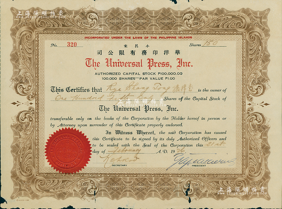 1936年华洋印务有限公司股票,面额150股(每股1比索),由广东华侨发行于小吕宋(即菲律宾);中国华侨老股票之初见品,亦属首度公诸于拍卖,有小破损,七成新