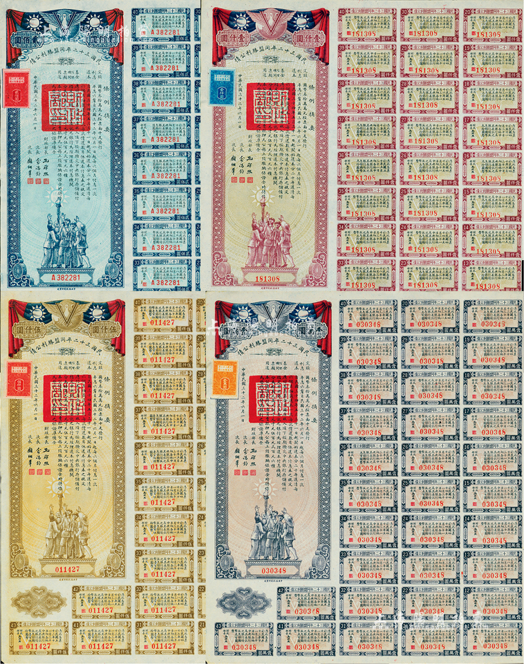 民国三十二年同盟胜利公债贰佰圆、壹仟圆、伍仟圆、壹万圆共4枚不同,其中大面额券存世少见,均由财政部长孔祥熙签署,附带有息票,八五成新