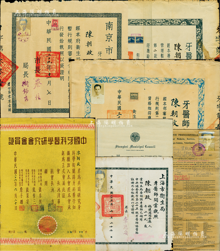 民国牙医证书7种,详分:1936年行政院卫生署“牙医师证书”1张,由署长刘瑞恒(中国近代公共卫生事业创建者)签署;1936年上海市卫生局“牙医师开业执照”1张;1937年上海法租界公董局卫生处“牙医登记证书”1张;1940年“南京市政府牙医师开业执照”1张;1942年上海公共租界工部局卫生处“牙医登记证书”1张;1947年卫生部“牙医师证书”1张,由部长周诒春(清华大学奠基人兼校长)签署;1947年“中国牙科医学研究会会员证书”1张;以上证书均由福建同安籍陈朝政氏所执有,保存尚可,敬请预览