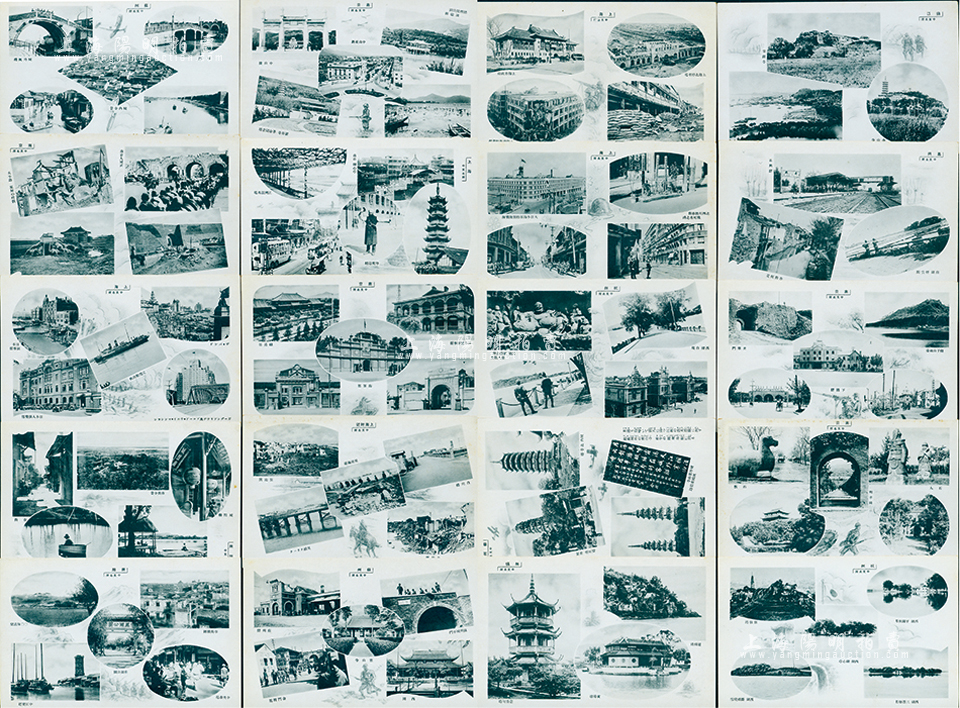民国时期明信片一组共20张,内含上海、南京、苏州、无锡、杭州、嘉兴、镇江、芜湖等地名胜风景图,其每张底图上均有各种侵华日军图案,诚属日本侵华之历史罪证;保存甚佳,敬请预览