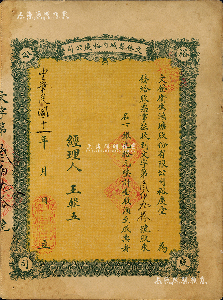民国十一年(1922年)文登县城内裕庆公司(又称:文登卫生澡塘股份有限公司裕庆堂)股票,壹股计银元拾元;此种山东省“洗澡堂子”发行的老股票,存世或仅此一例;近八成新
