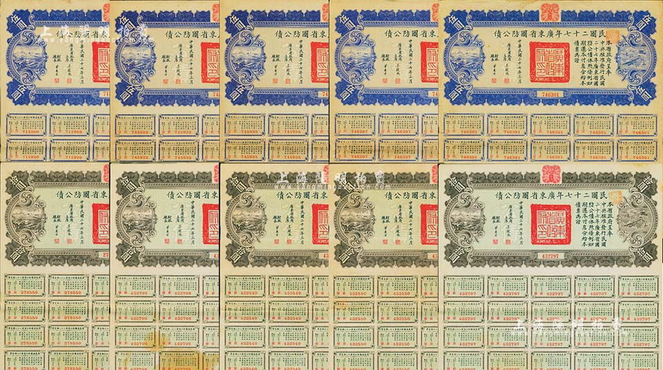 民国二十七年广东省国防公债伍圆5枚、拾圆5枚,合计共有10枚,由广东省政府主席吴铁城签署,附带有息票;海外藏家出品,七五至八五成新