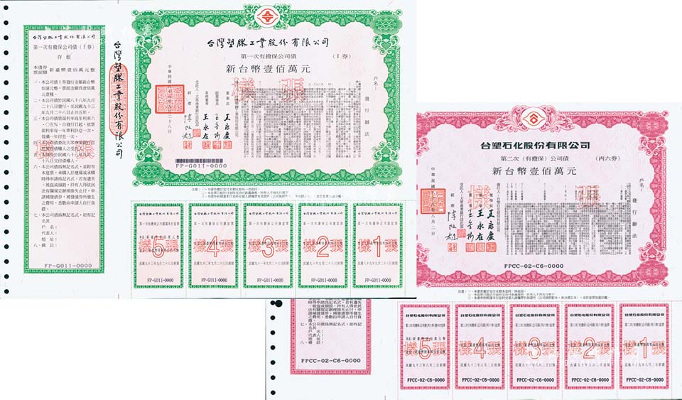 1999年台湾债券2种,详分:台湾塑胶工业股份有限公司第一次有担保公司债新台币壹佰万元、台塑石化股份有限公司第二次(有担保)公司债新台币壹佰万元,票上董事长均为台湾首富王永庆氏;此二种均属样张,内有水印,九五成新