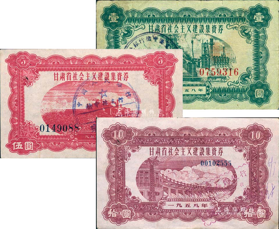 1958年甘肃省社会主义建设集资券壹圆、伍圆、拾圆共3枚不同,八至八五成新