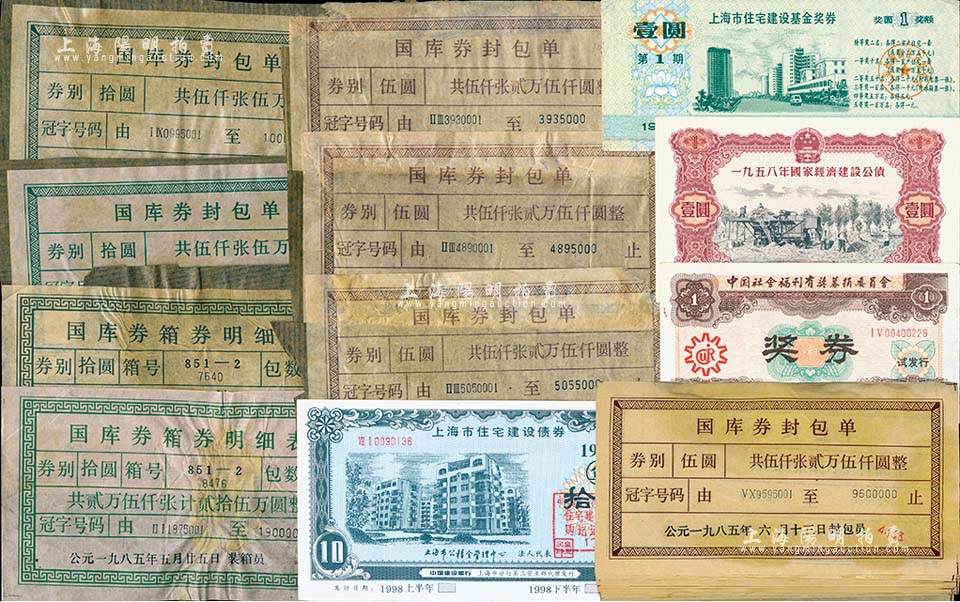 债券等一宗共40枚,详分:1998年上海市住宅建设债券拾圆;1987年上海市住宅建设基金奖券第1期壹圆;1958年国家经济建设公债壹圆;1987年中国社会福利有奖募捐委员会奖券(试发行);80年代国库券封包单36枚;保存甚佳,敬请预览