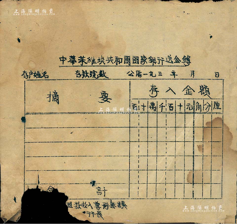 193x年“中华苏维埃共和国国家银行送金簿”1页,空白未填用,此乃中华苏维埃共和国国家银行之历史实物,值得重视;下边有缺损,六成新