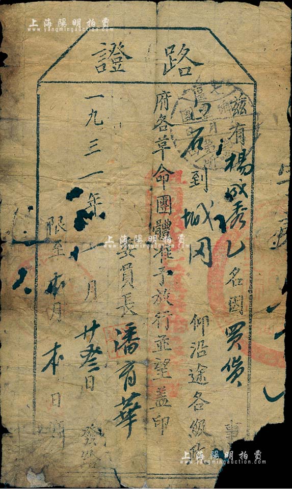 1931年兴国县七区苏维埃政府“路证”1张,“兹有杨成秀因买货事自白石至城冈,仰沿途各级政府各革命团体准予放行”,由委员长潘育华签发;此乃红军时代之关卡通行证,足见战时形势之紧张,亦属珍贵之革命文物,值得研究和推重;有缺损,保存尚可,敬请预览