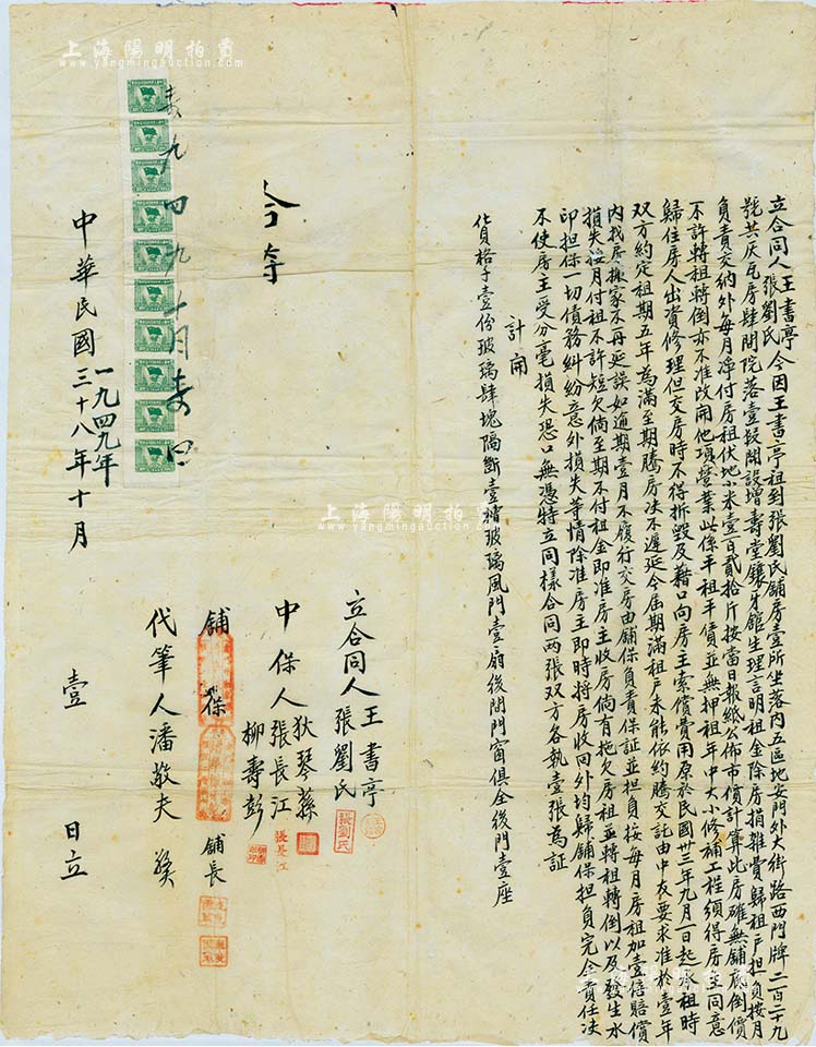 1949年10月1日老北京“合同”一份,事为王书亭租到张刘氏坐落于北平地安门外大街路西门牌229号灰瓦房4间院落,开设增寿堂镶牙馆,其上言明租金、责任等细节,内容颇为详尽;值得一提的是,此合同签订于1949年10月1日(即中华人民共和国开国典礼之日),堪称新中国开国之第一份商业合同,值得珍视和推重;保存甚佳,敬请预览