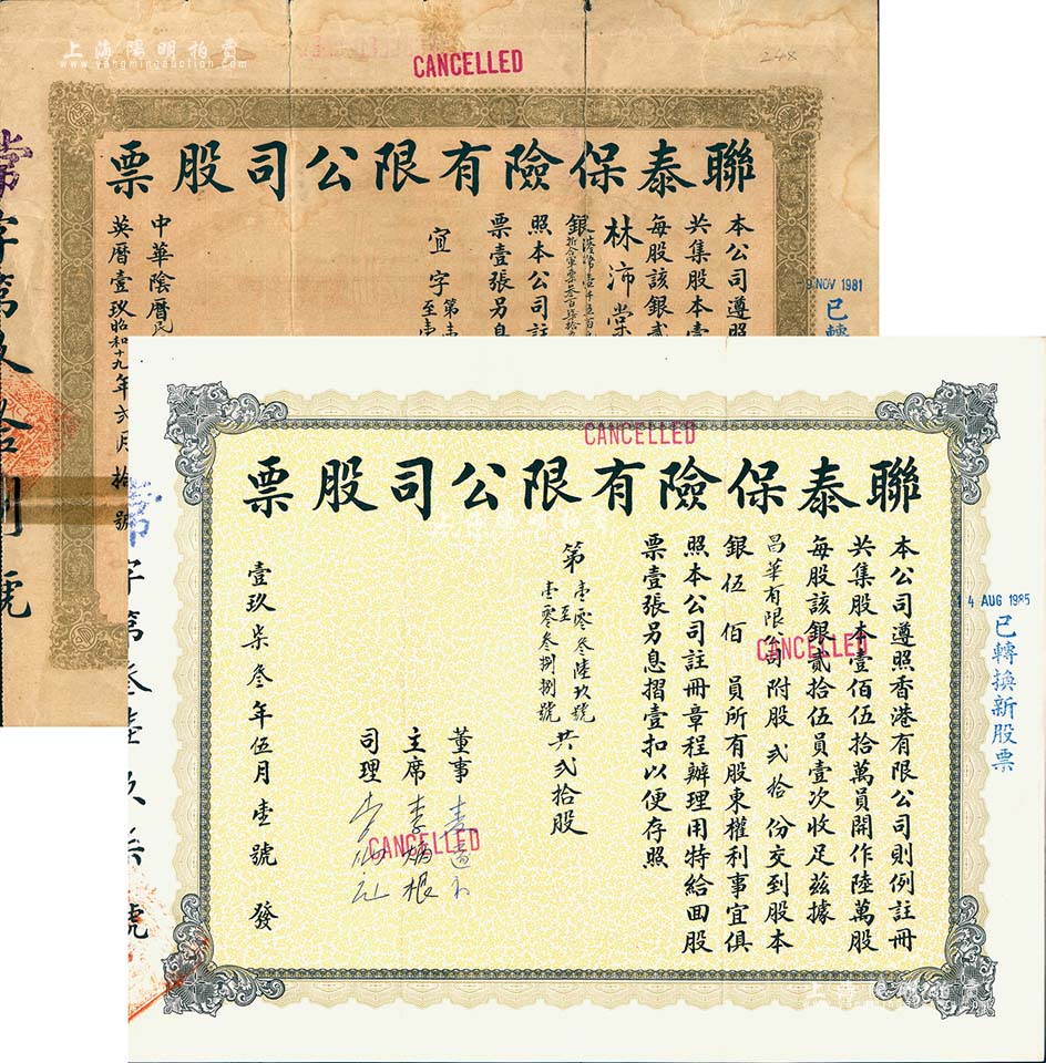 联泰保险有限公司股票2种,详分:1944年陆拾股计港币壹千五百元(折合军票叁百柒拾五元),发行于日本侵占香港时代,票上主席李葆葵为香港著名绅商(曾任农商部顾问,获有嘉禾勋章);1973年贰拾股计股本银伍佰员;其中1枚有贴补,七至八五成新
