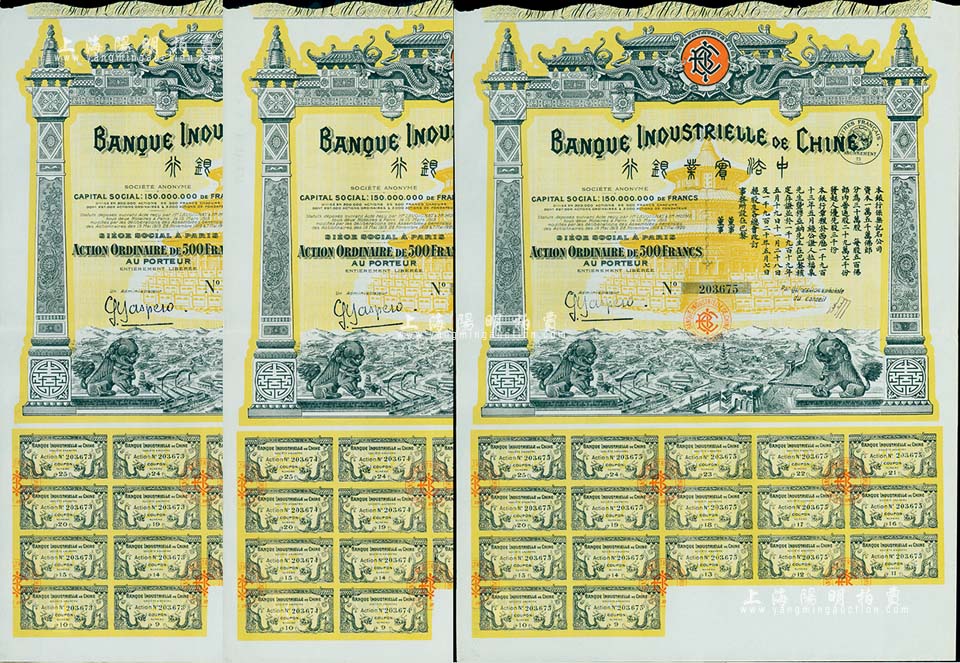 1920年中法实业银行股票500法郎共3枚连号,均附带有完整息票,图案精美,海外藏家出品,九成新
