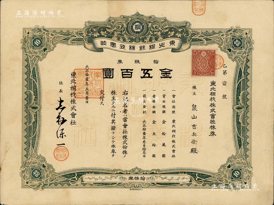 大正拾壹年(1922年)东北桐材株式会社株券,拾株券金五百圆,其股票号码仅为“第1号”,尤为值得珍视,八成新