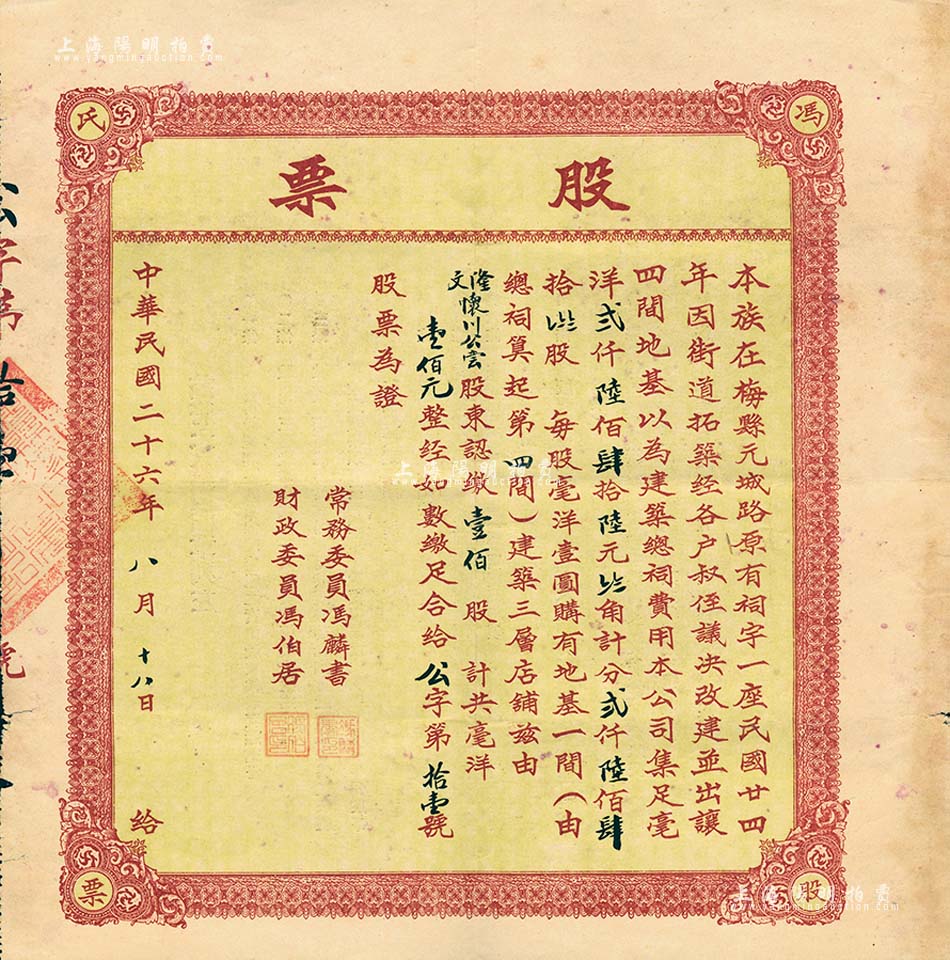 民国二十六年(1937年)冯氏股票,壹佰股计毫洋壹佰元,背印公司简章;广东梅县杨氏家族之地产类老股票,事为“利用家族原有祠宇改建并出让四间地基并建筑三层店铺”等情,罕见品,近八成新