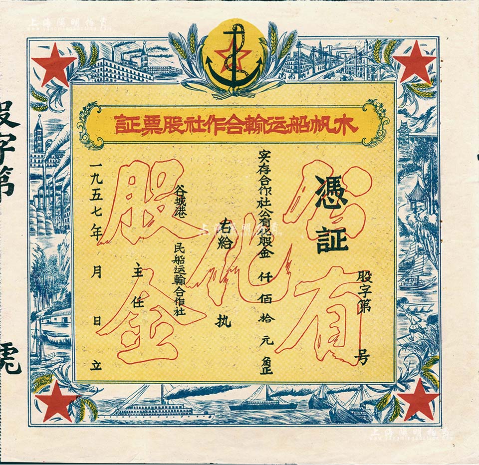 1957年(谷城港)木帆船运输合作社股票证,未填用,上印“公有化股金”等空心字,票之四周图案精美,极富时代之记忆;湖北老股票之别致佳品,八五成新