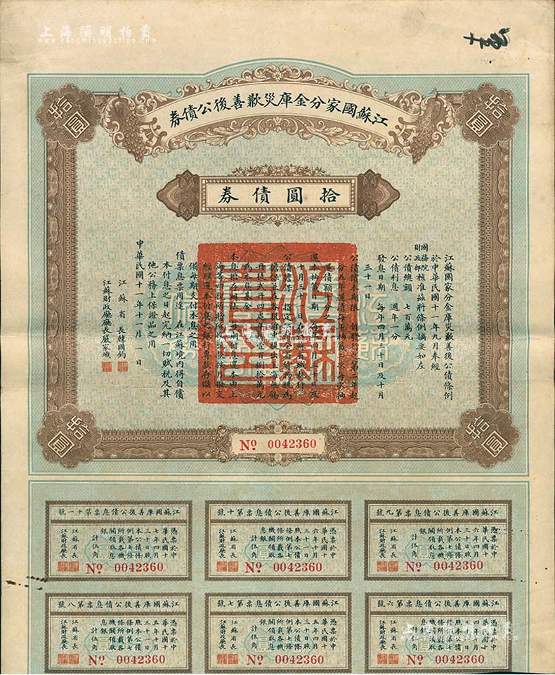 民国十一年(1922年)江苏国家分金库灾歉善后公债券拾圆,由江苏省长韩国钧、财政厅长严家炽签署,八成新