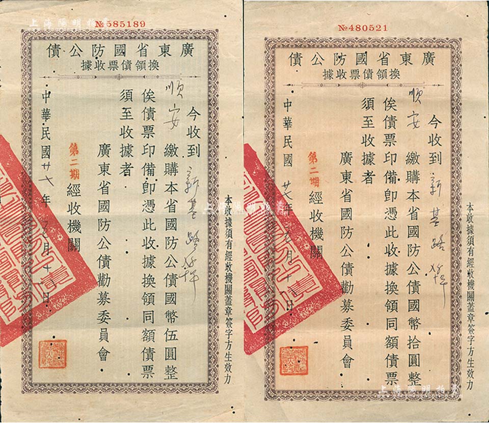 民国廿七年(1938年)广东省国防公债换领债票收据共2种不同,分别为绿色底纹版伍圆、淡红色底纹版拾圆,八成新
