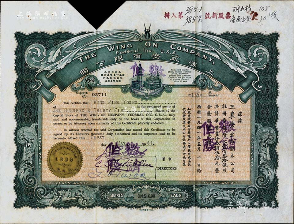 1941年上海永安有限公司股票,壹佰叁拾伍股计华币壹仟叁佰伍拾元,深绿色印刷,剪角注销,八成新