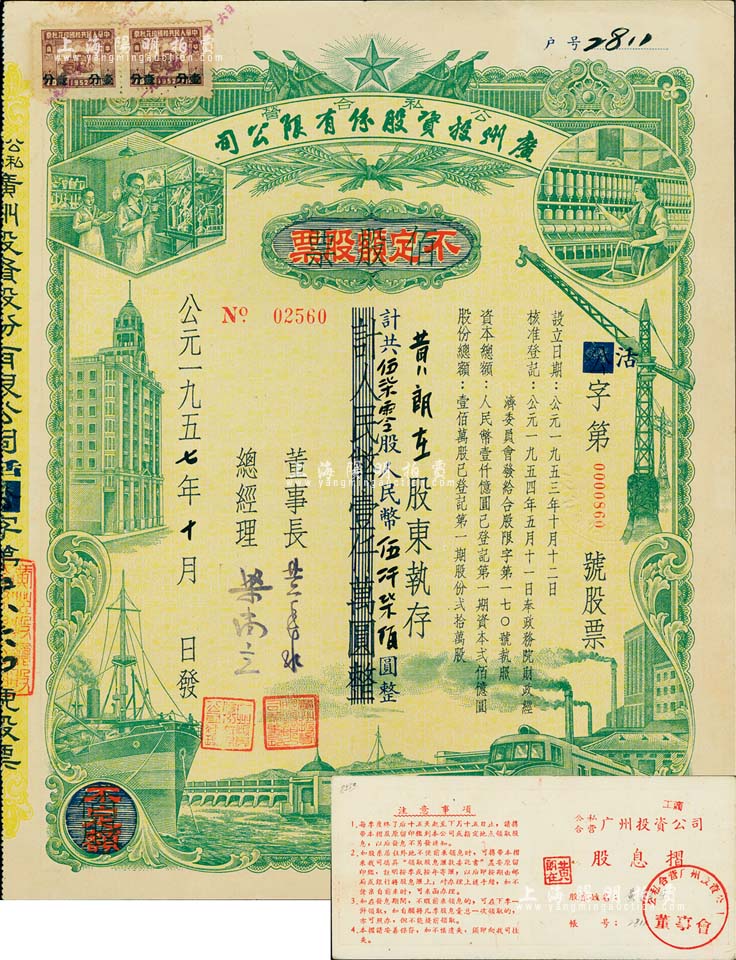 1957年(公私合营)广州投资股份有限公司股票,佰股票改作不定额股票,570股计人民币5700元,另附带该股东之股息摺1张;此种改值券存世少见,八五成新