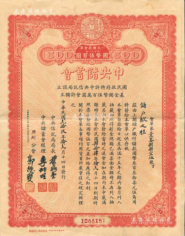 民国贰拾玖年(1940年)中央储蓄会会单,广州分会发行,面额四分之一会国币伍百圆;森本勇先生藏品,八成新