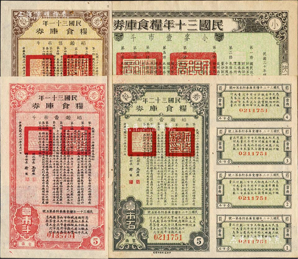 国民政府“粮食库券”共4枚不同,详分:民国三十年(陕西)小麦壹市斗;民国三十一年(安徽)稻谷壹市斗、伍市斗;民国三十二年(云南)壹市石;森本勇先生藏品,九成至全新