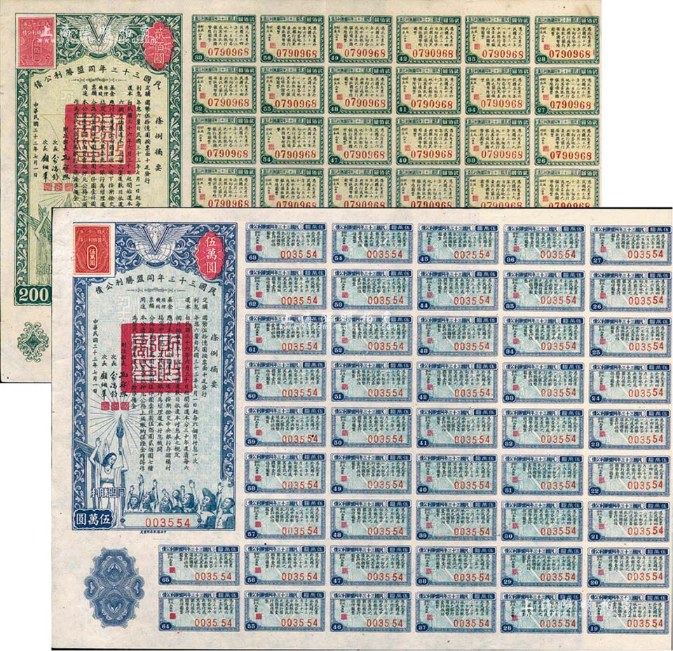 民国三十三年同盟胜利公债贰佰圆、伍万圆共2枚不同,均由财政部长孔祥熙等签署,附带有息票;森本勇先生藏品,八五成新
