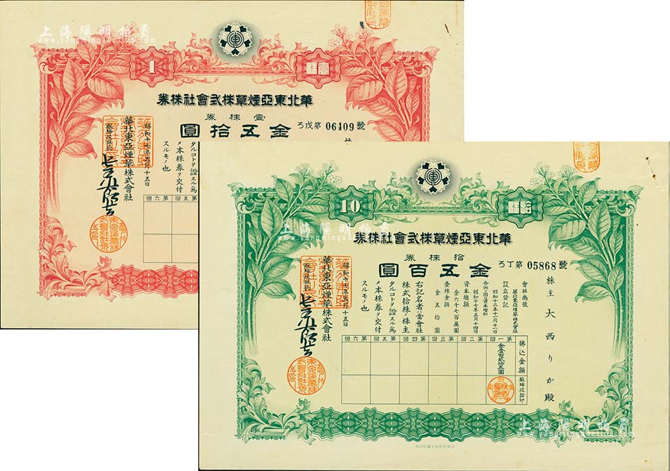 昭和十七年(1942年)华北东亚烟草株式会社株券共2种,详分:红色壹株券金五拾圆、绿色拾株券金五百圆,由同一股东所承购,另附领收证1张;九五成新