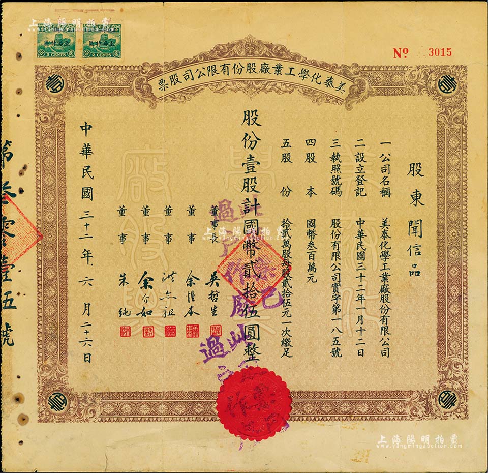 民国三十二年(1943年)美泰化学工业厂股份有限公司股票,棕色壹股计国币贰拾伍圆,七五成新