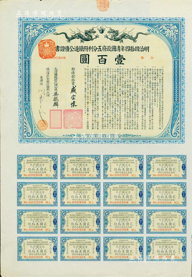 明治四拾四年(宣统叁年,1911年)清国政府五分利附铁道公债证书壹百圆,由邮传部尚书盛宣怀、驻日公使吴振麟等签名发行,附带有息票;有水印,八五成新