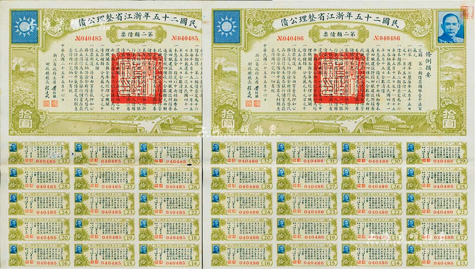 民国二十五年浙江省整理公债·第二类债票拾圆共2枚连号,由浙江省政府主席黄绍竑(国民党要员、新桂系创始人)签署;附带有息票,八五成新