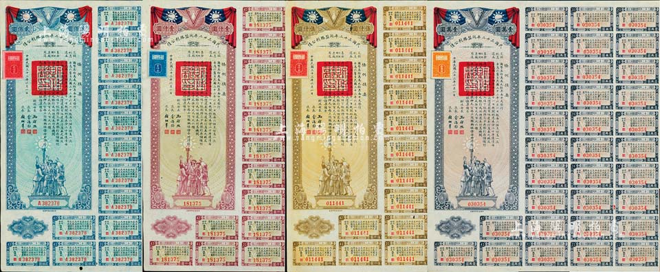 民国三十二年同盟胜利公债贰佰圆、壹仟圆、伍仟圆、壹万圆共4枚不同,其中大面额券存世少见,均由财政部长孔祥熙签署,附带有息票,八至八五成新