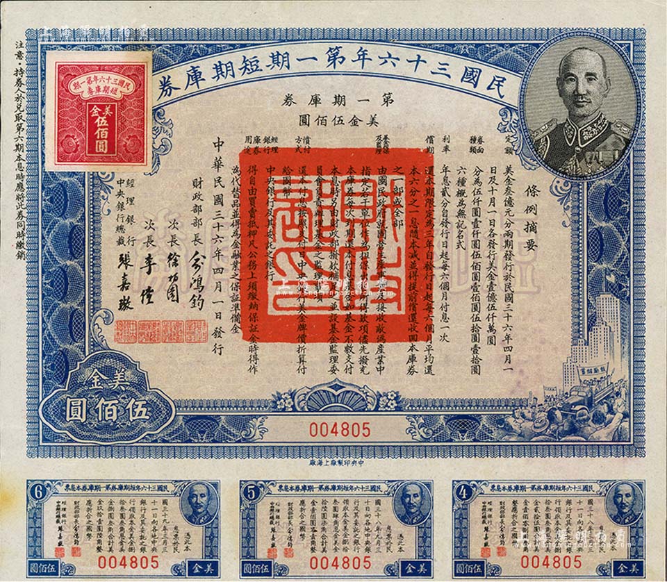 民国三十六年第一期短期库券美金伍佰圆,上印蒋介石肖像,附带有息票,八五成新