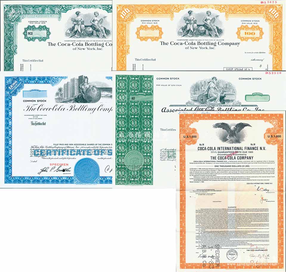 1970至1982年(美国)可口可乐公司股票、债券样张共5种不同,其中:4张为股票,图案、颜色各异,发行地分纽约和迈阿密等,面额或空白、或定额100股、或限定100股以内;债券1张,1982年面额1000美元;源于美国印钞厂档案,雕刻版印刷极其精致;海外藏家出品,八五至全新