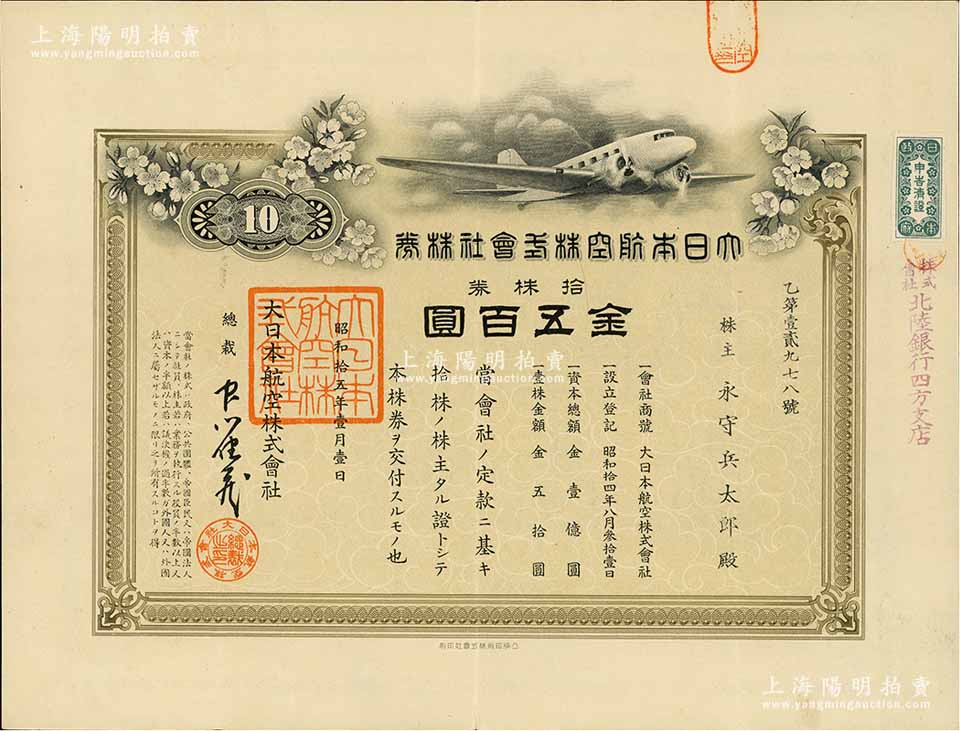 昭和拾五年(1940年)大日本航空株式会社株券,拾株券金五百圆;该公司属世界第三大航空公司,世界500强企业之一,八五成新