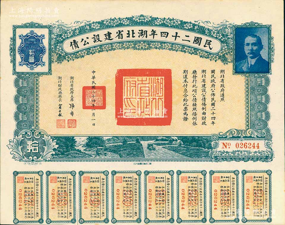 民国二十四年湖北省建设公债拾圆,由湖北省政府主席张群、财政厅长贾士毅签名,附带有息票,九成新