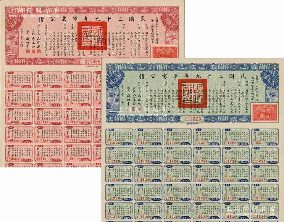 民国二十九年军需公债伍拾圆、壹佰圆共2枚不同,均附带息票,九成新