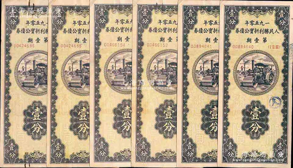1950年人民胜利折实公债券·第壹期壹分共6枚,均为实用票且附带息票,七五至八成新