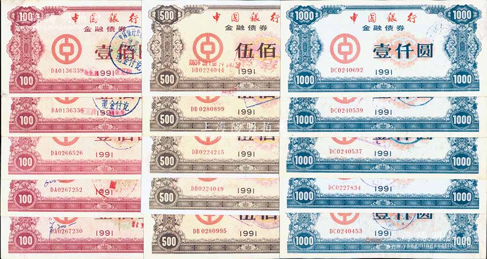 1991年中国银行金融债券壹佰圆、伍佰圆、壹仟圆3枚全套共5套(合计15枚),有水印,八至九成新