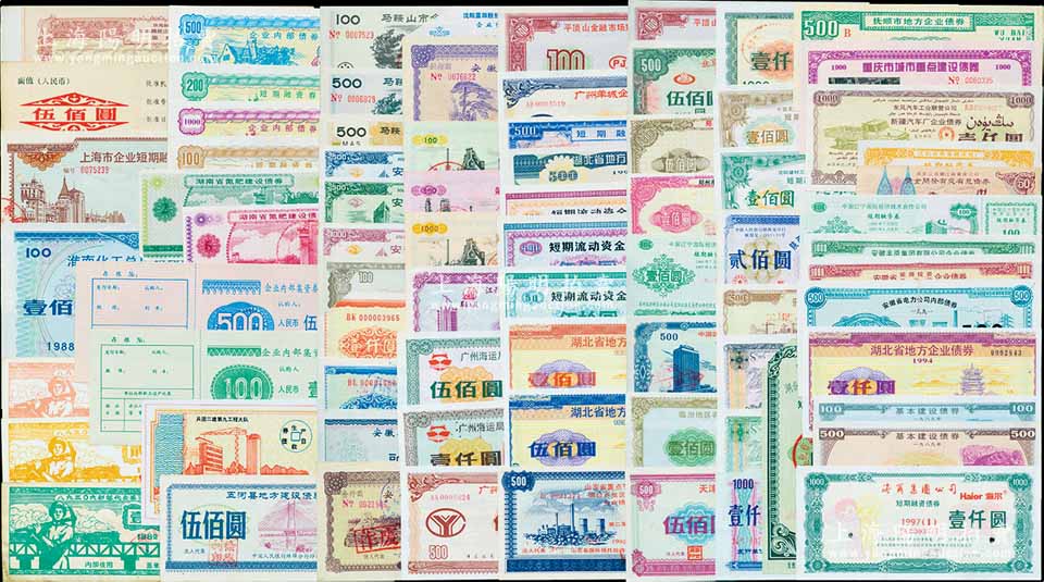 1988至1998年新中国上市公司、地方政府及企业债券共73种不同,内中涉及黑龙江、辽宁、北京、天津、山东、湖北、湖南、安徽、广东、上海、四川新疆等诸多省市,部分有水印,品种丰富,难以细述,八成至全新,敬请预览(另附送1982年部队代金券3种)