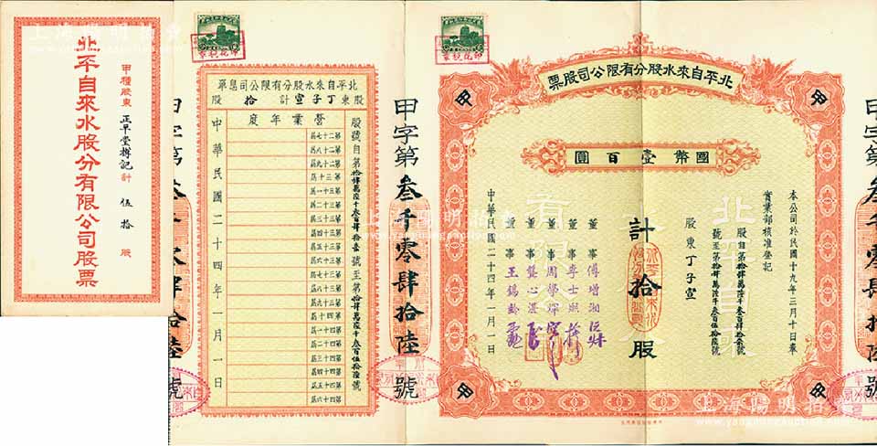 民国二十四年(1935年)北平自来水股份有限公司股票,红色甲种拾股计国币壹百圆,票上董事傅增湘曾任北洋政府教育总长,附带有封套;九成新