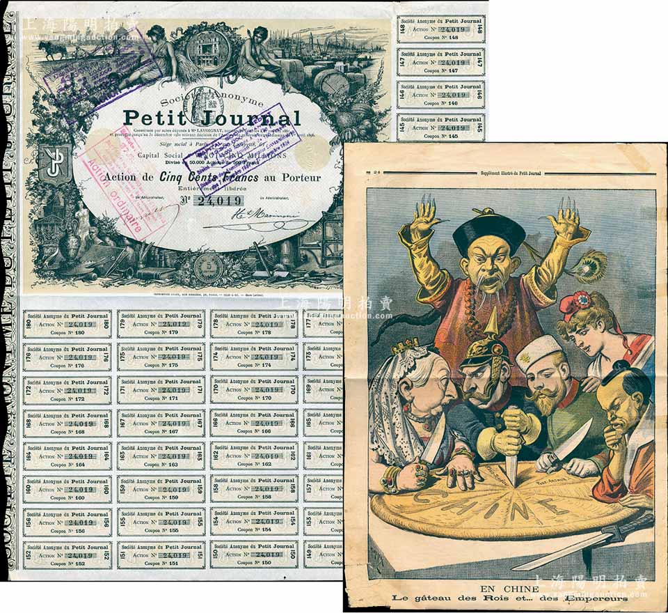 1896年法国小日报公司股票,1股计500法郎,附带有息票,此乃法国最流行的通俗类市民报纸,票上所印之硬币即代表其一贯之廉价5生丁;另附1898年《小日报》1份,其上整版所印之漫画图,即以“化身为李鸿章模样的中国,面对英、德、俄、法、日等列强的瓜分而气急败坏,却无力制止”之场景;海外藏家出品,少见,八成新