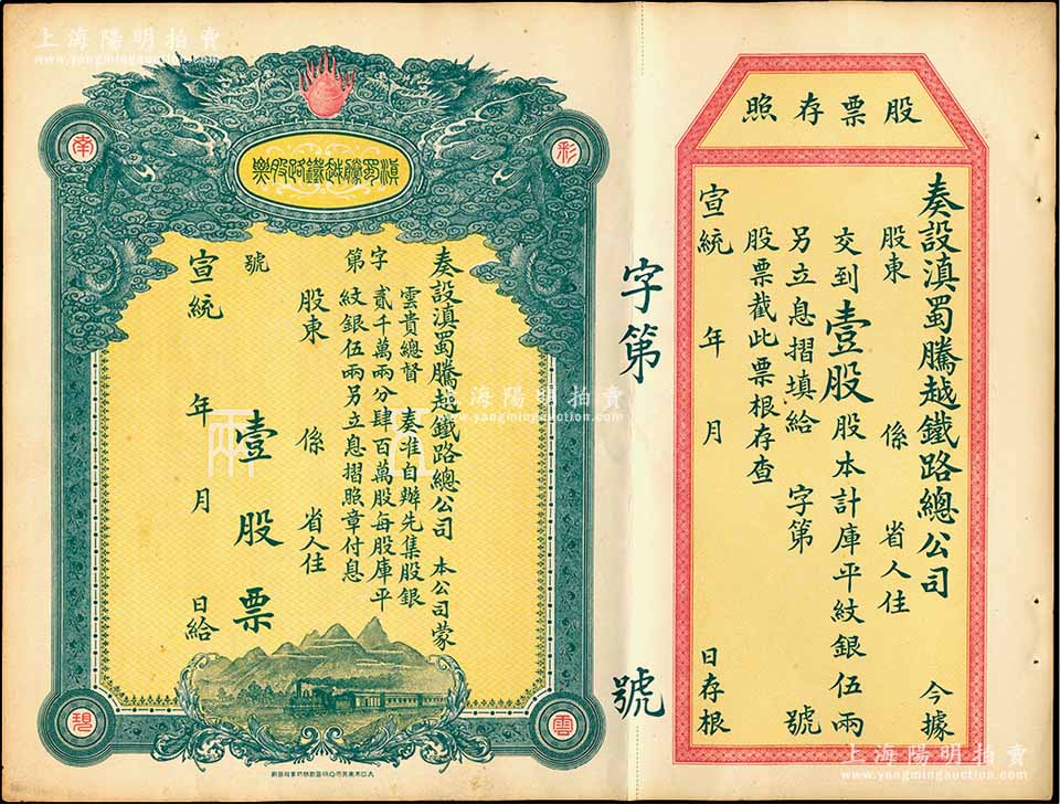 宣统年(1909-11年)滇蜀腾越铁路股票,壹股计库平纹银伍两,双龙图,未填用带存根,日本印制有水印,九成新
