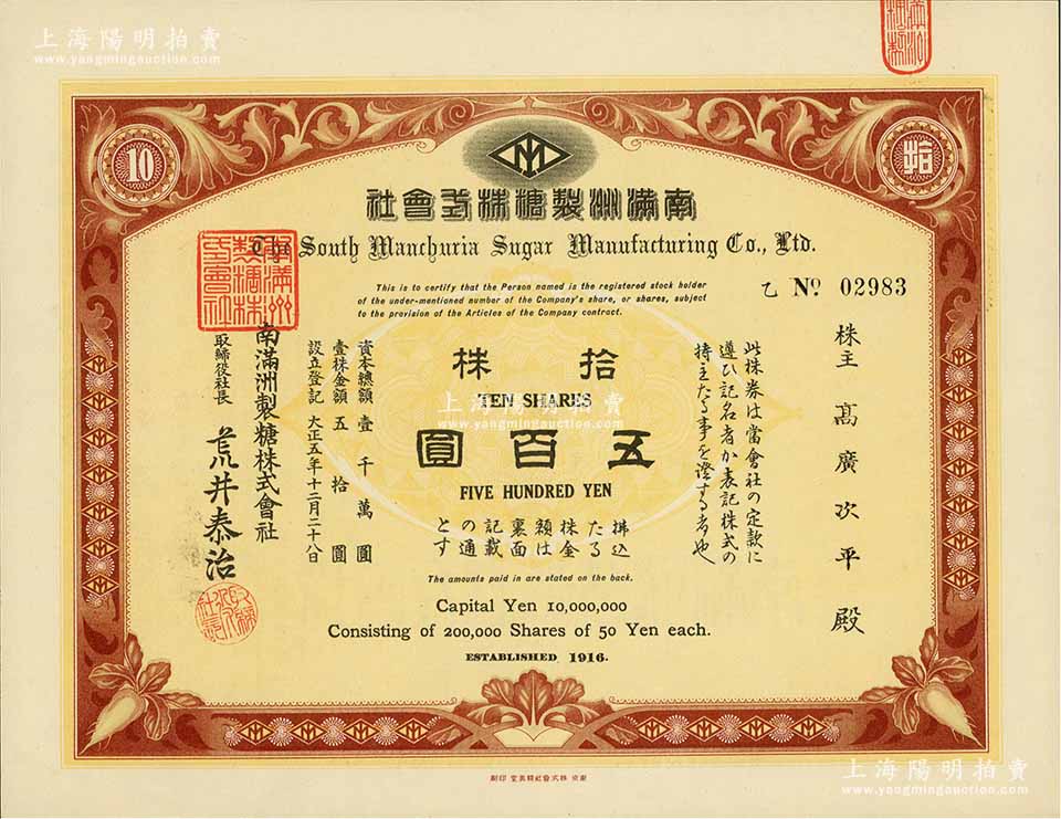 大正五年(1916年)南满洲制糖株式会社株券,拾株计五百圆,有水印,九五成新