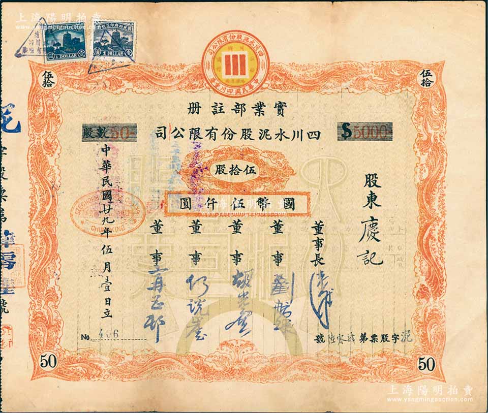 民国廿九年(1940年)四川水泥股份有限公司股票,伍拾股计国币伍仟圆,该公司设于重庆,票上董事刘航琛乃四川著名之工商业、金融业巨子;陈伟国先生藏品,且为其著作《中国近代名人股票鉴藏录》一书第61页之图片原物,八成新