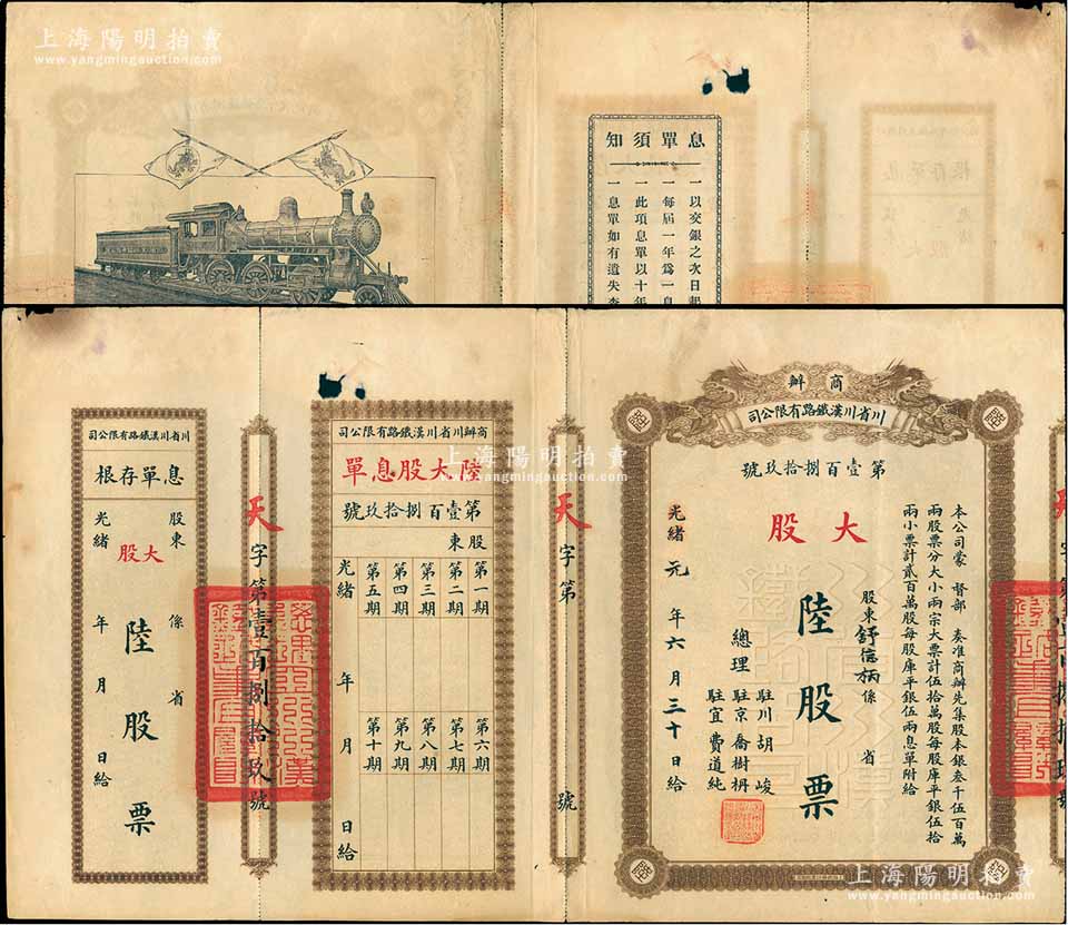 光绪改民国元年(1912年)商办川省川汉铁路有限公司股票,棕色大股陆股票(每股库平银伍两),附带有息单和存根;息单上端空白处有小破损,七五成新